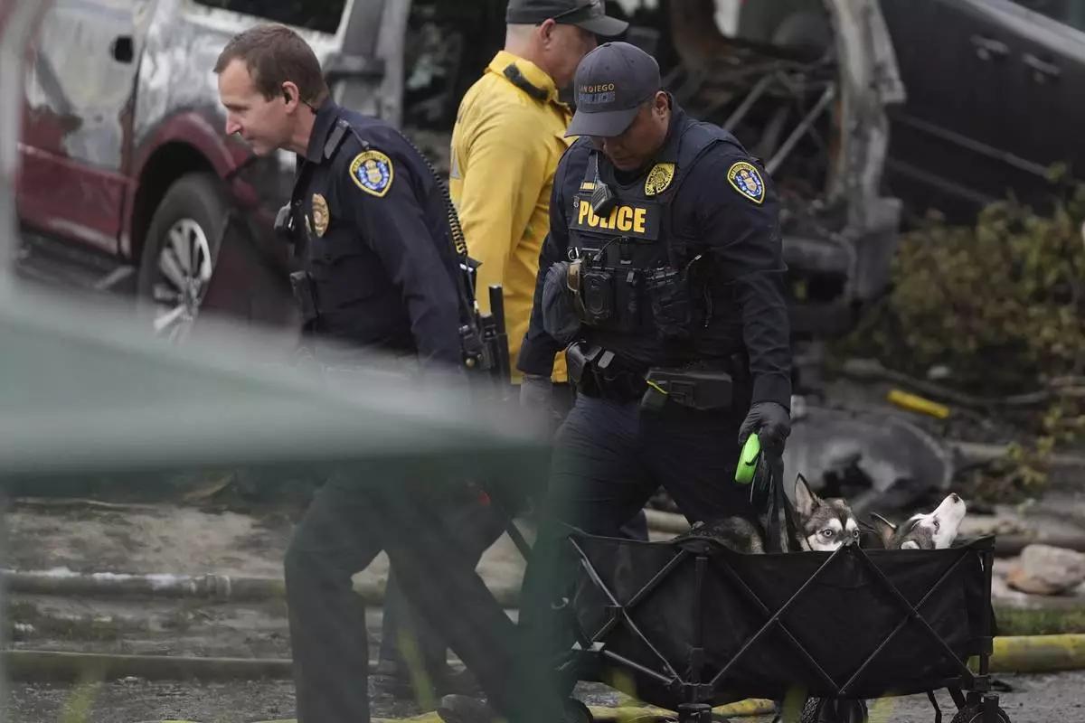 Police help rescue dogs from a home after a small plane crashed into a San Diego neighborhood earlier, setting several homes on fire and forcing evacuations along several blocks, Thursday, May 22, 2025. (AP Photo/Gregory Bull)