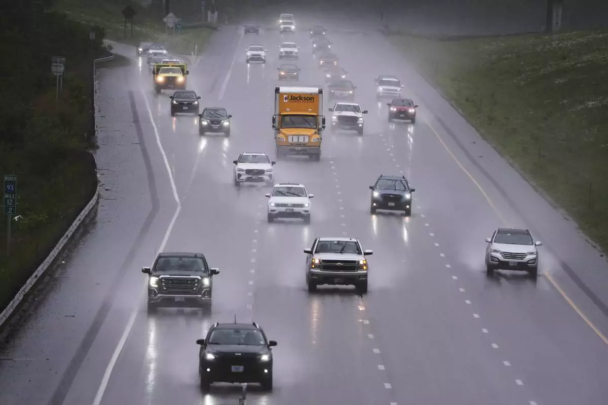As rain from a nor'easter falls on the pavement, vehicles roll north on Route 93 during the start of the Memorial Day holiday travel, Thursday, May 22, 2025, in Londonderry, N.H. (AP Photo/Charles Krupa)