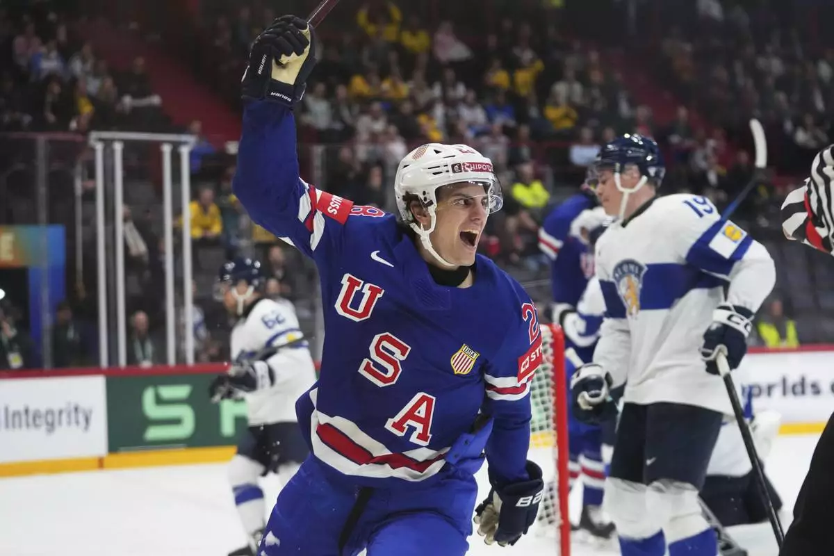 The United States' Zeev Buium celebrates after scoring against Finland during the second period of a quarterfinal match at the ice hockey world championships in Stockholm, Sweden, Thursday, May 22, 2025. (AP Photo/Petr David Josek)