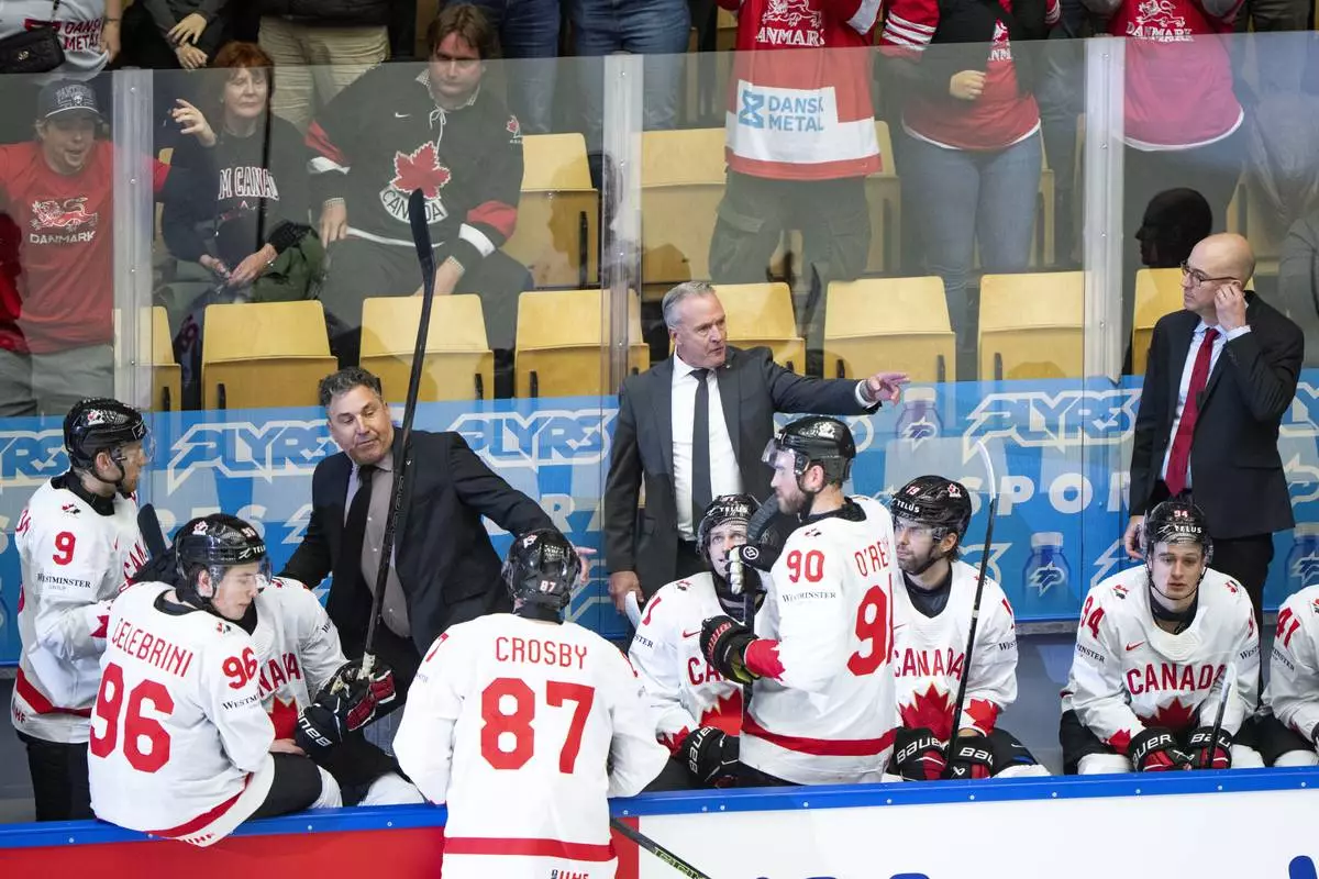 Canada's head coach Dean Evason, center rear, and his team react after a quarterfinal game between Canada and Denmark at the hockey world championships, Thursday, May 22, 2025, in Herning, Denmark. (Bo Amstrup/Ritzau Scanpix via AP)