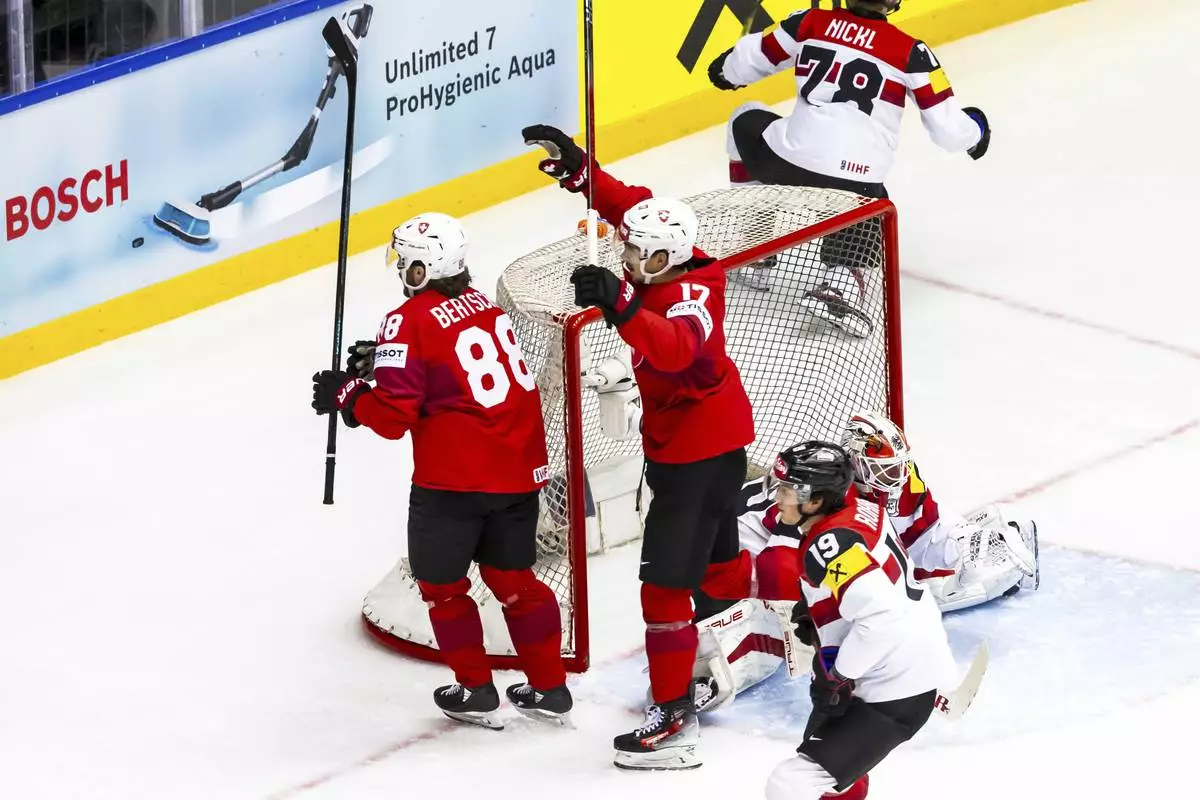 Switzerland's forward Christoph Bertschy (88) celebrates scoring during the ice hockey World Championship quarter final game between Switzerland and Austria, at the Jyske Bank Boxen, in Herning, Denmark, Thursday, May 22, 2025. (Salvatore Di Nolfi/Keystone via AP)