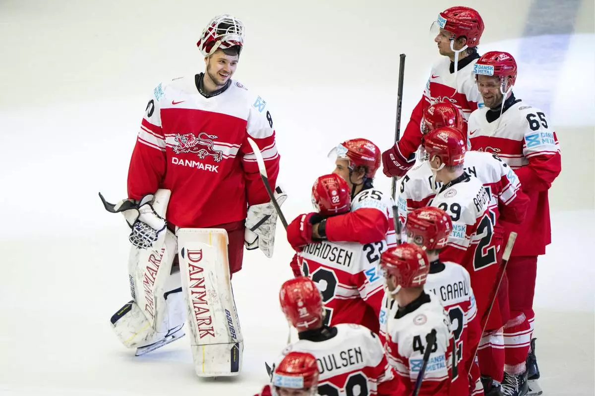 Denmark players celebrate after their 2-1 win in a quarterfinal game between Canada and Denmark at the hockey world championships, Thursday, May 22, 2025, in Herning, Denmark. (Bo Amstrup/Ritzau Scanpix via AP)