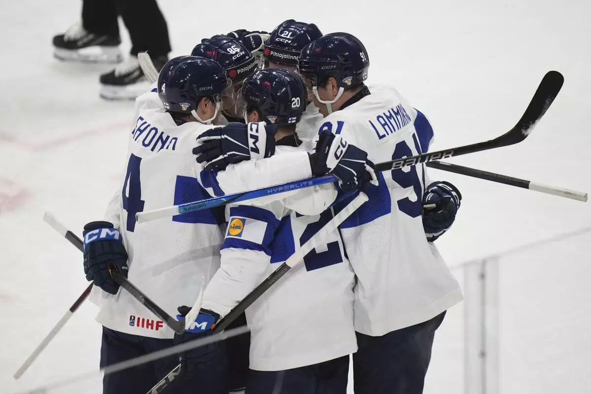 Finland's Eeli Tolvanen (20) celebrates with teammates after scoring against the United States during the first period of a quarterfinal match at the ice hockey world championships in Stockholm, Sweden, Thursday, May 22, 2025. (AP Photo/Petr David Josek)