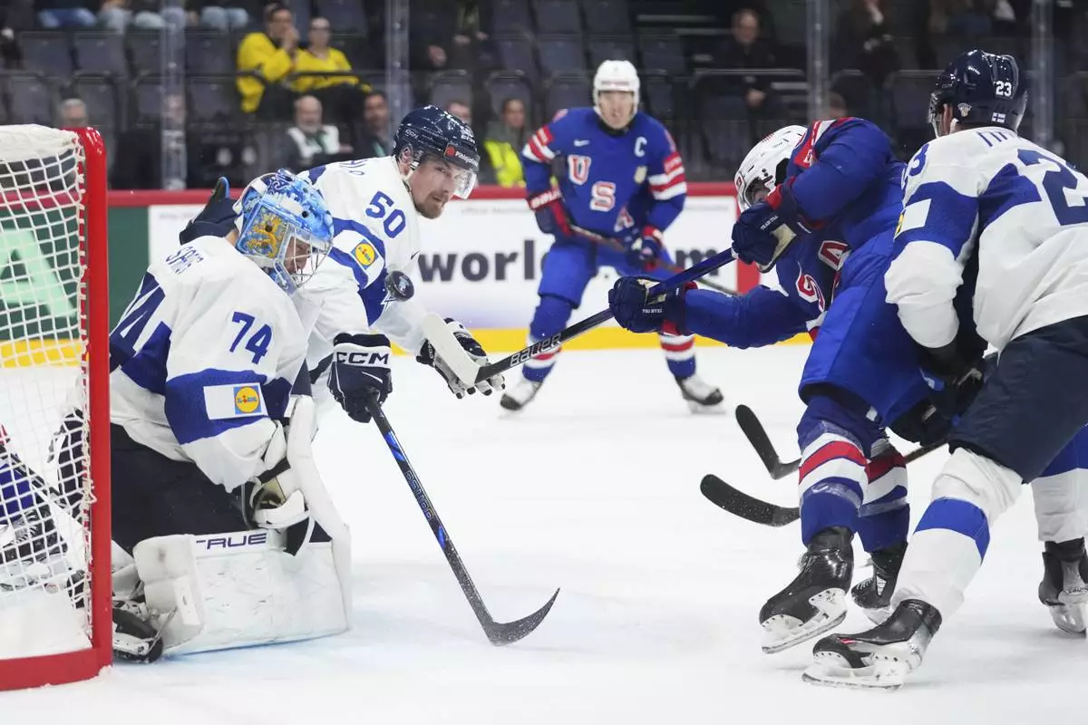 The United States' Conor Garland, second from right, scores a goal against Finland's Juuse Saros (74), Mikael Seppala (50) and Nikolas Matinpalo, right, during the second period of a quarterfinal match at the ice hockey world championships in Stockholm, Sweden, Thursday, May 22, 2025. (AP Photo/Petr David Josek)