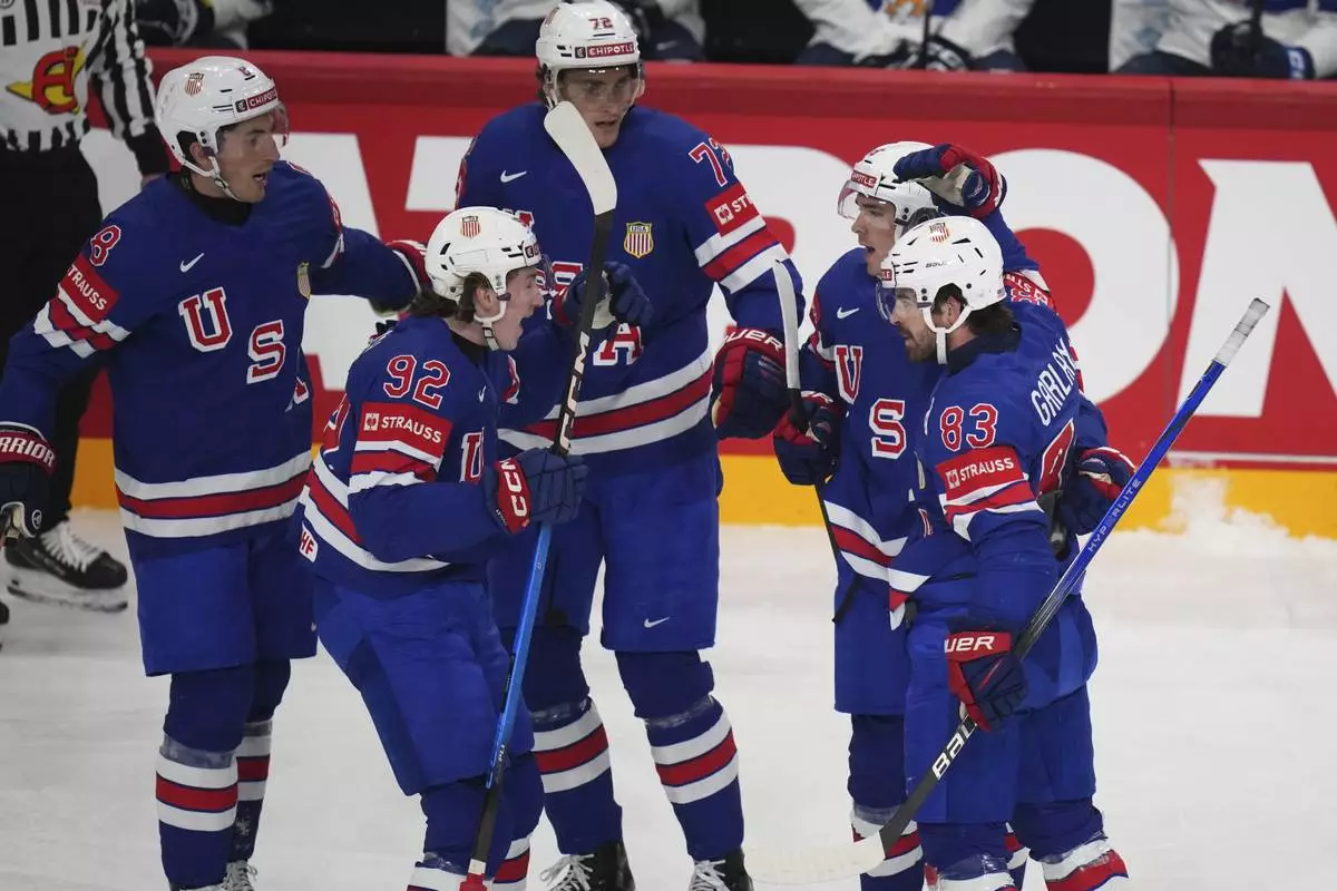 The United States' Conor Garland (83) is congratulated by teammates after scoring against Finland during the first period of a quarterfinal match at the ice hockey world championships in Stockholm, Sweden, Thursday, May 22, 2025. (AP Photo/Petr David Josek)