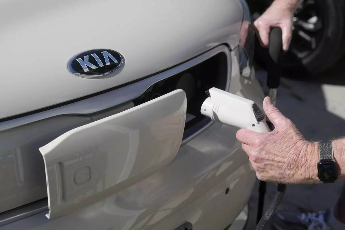 FILE - Ken Honeycutt demonstrates charging his Kia Soul electric vehicle in San Lorenzo, Calif., Nov. 9, 2024. (AP Photo/Jeff Chiu, File)