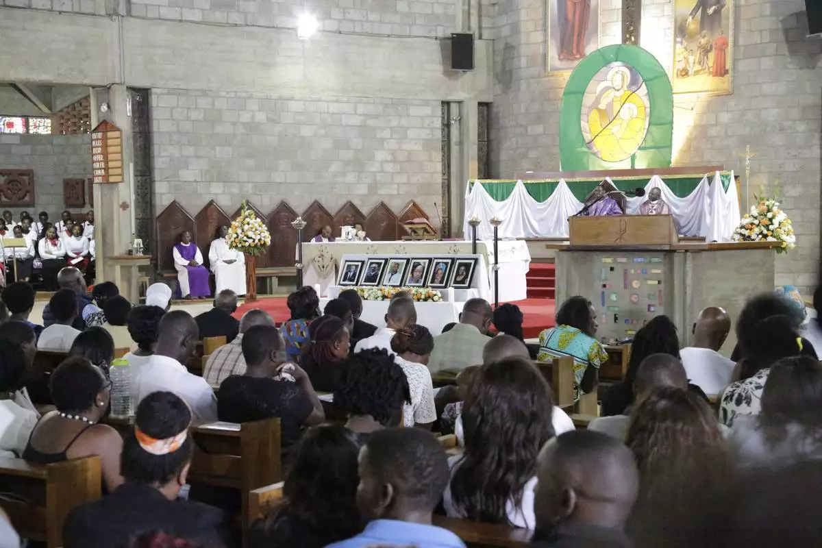 FILE - People attend the memorial service for the dusitD2 hotel staff, shown in the photographs from left, Zachary Nyambwaga, Derricks Lemisi, Erickson Momanyi, Trufosa Nyaboke, Bernadette Kanjalo and Beatrice Mutua at Consulate Shrine in Nairobi, Kenya, Jan. 23, 2019. (AP Photo/Khalil Senosi, file)