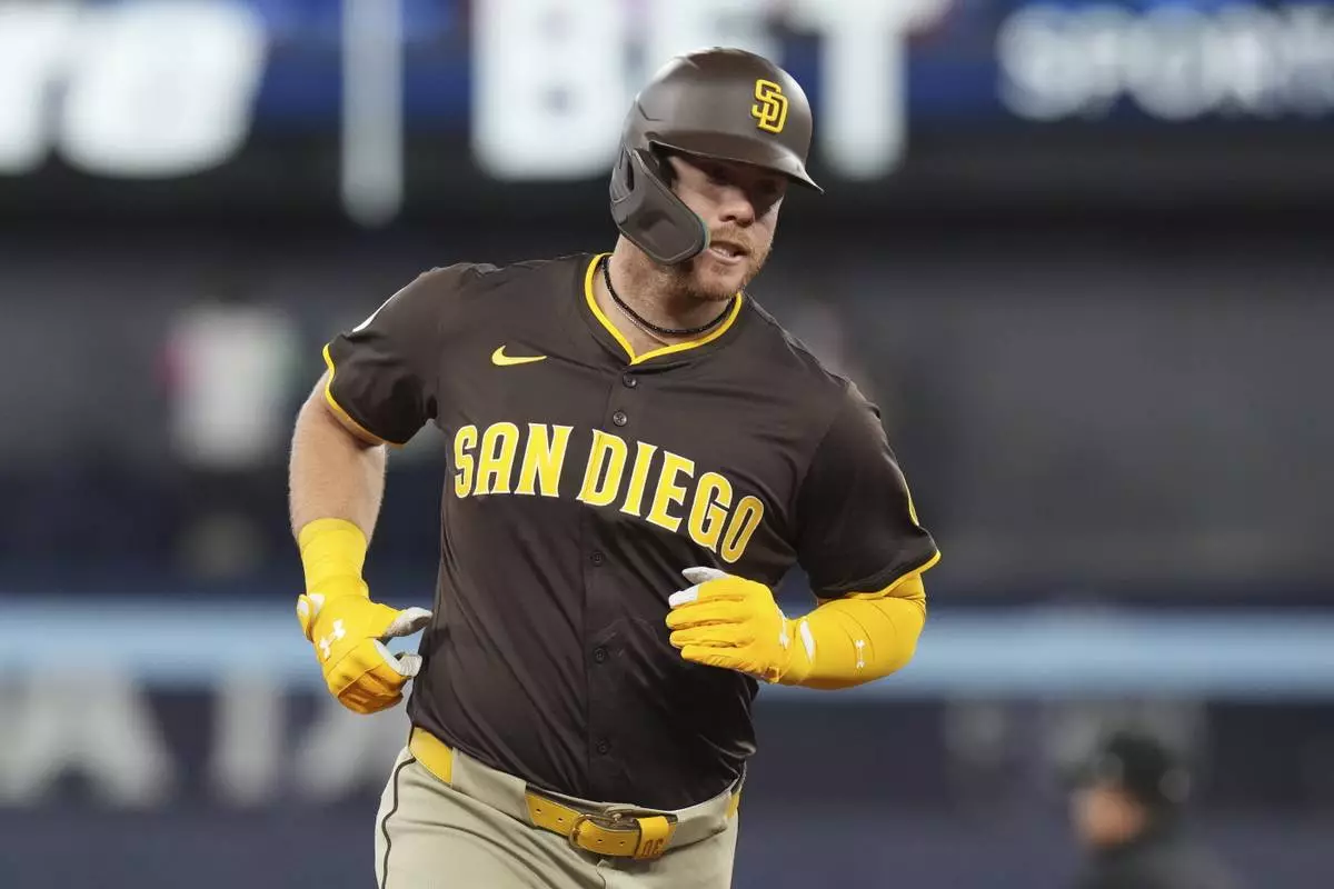 San Diego Padres' Gavin Sheets (30) rounds the bases after hitting a two-run home run off Toronto Blue Jays pitcher Bowden Francis during the second inning of a baseball game, Thursday, May 22, 2025, in Toronto (Chris Young/The Canadian Press via AP)