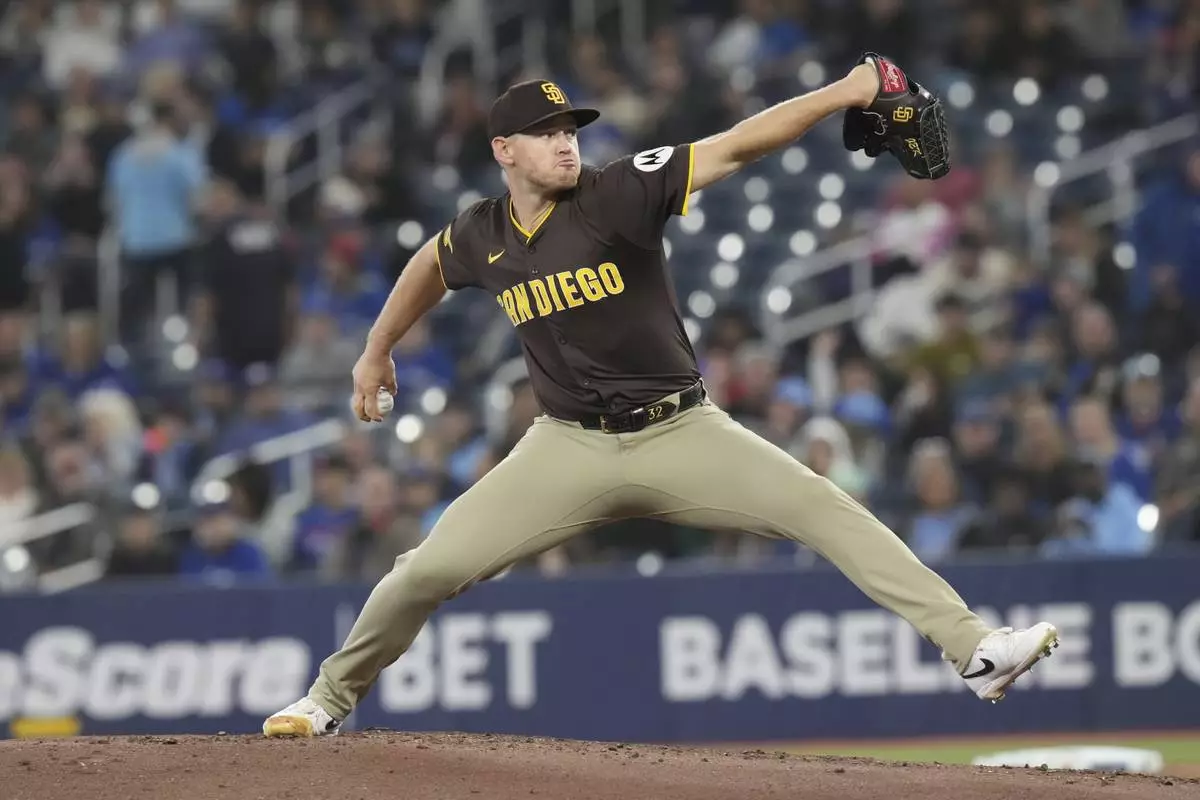 San Diego Padres pitcher Stephen Kolek (32) works against the Toronto Blue Jays during the first inning of a baseball game, Thursday, May 22, 2025, in Toronto (Chris Young/The Canadian Press via AP)