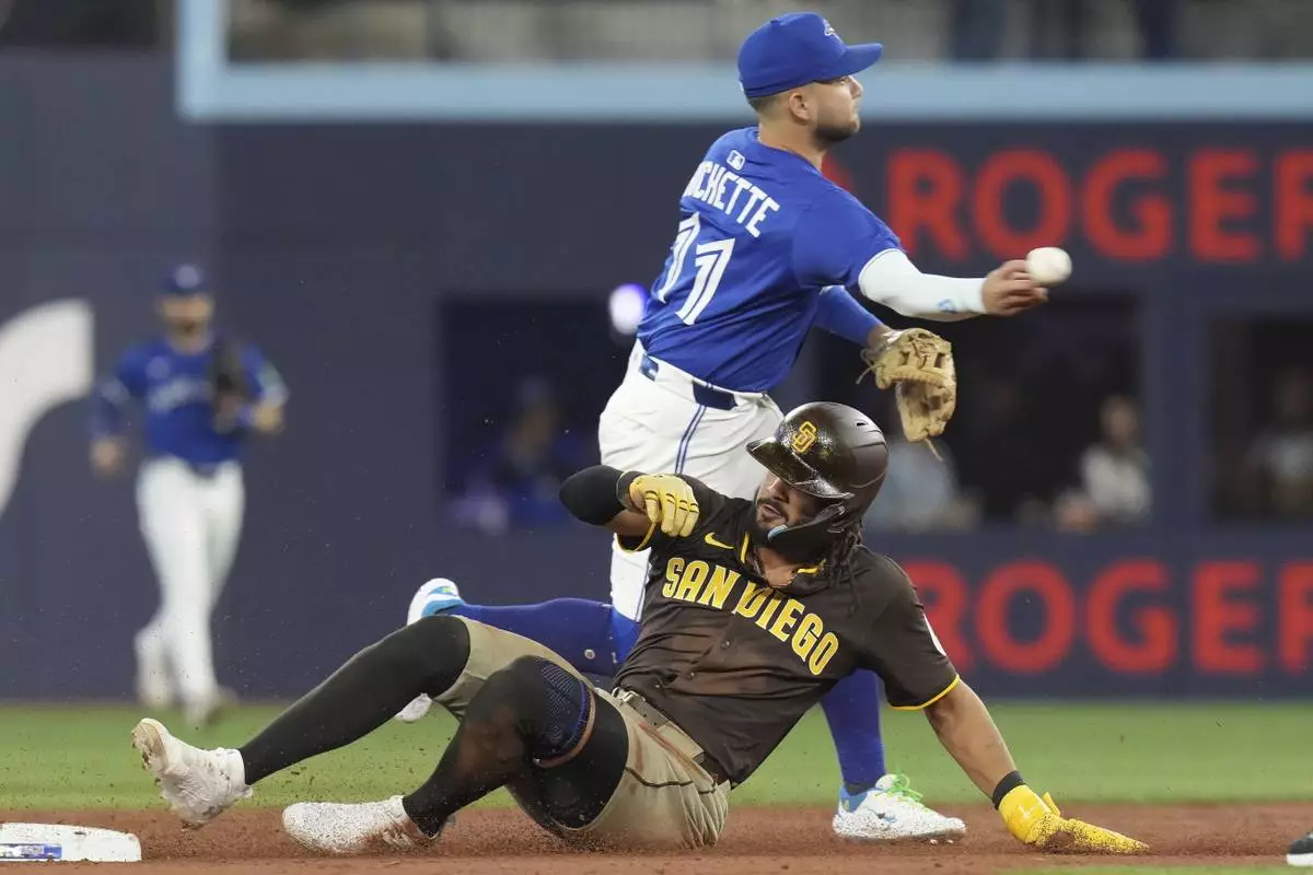 San Diego Padres' Fernando Tatis Jr. (23) is forced out at second base as Toronto Blue Jays shortstop Bo Bichette (11) throws to first base for a double play during the third inning of a baseball game, Thursday, May 22, 2025, in Toronto (Chris Young/The Canadian Press via AP)