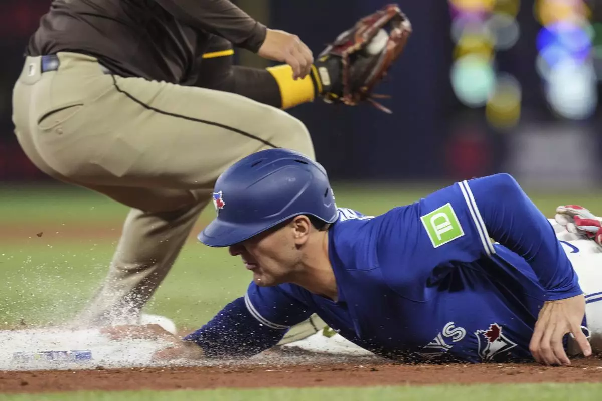 Toronto Blue Jays' Daulton Varsho (5) safely dives back into third base during the first inning of a baseball game against the San Diego Padres, Thursday, May 22, 2025, in Toronto (Chris Young/The Canadian Press via AP)