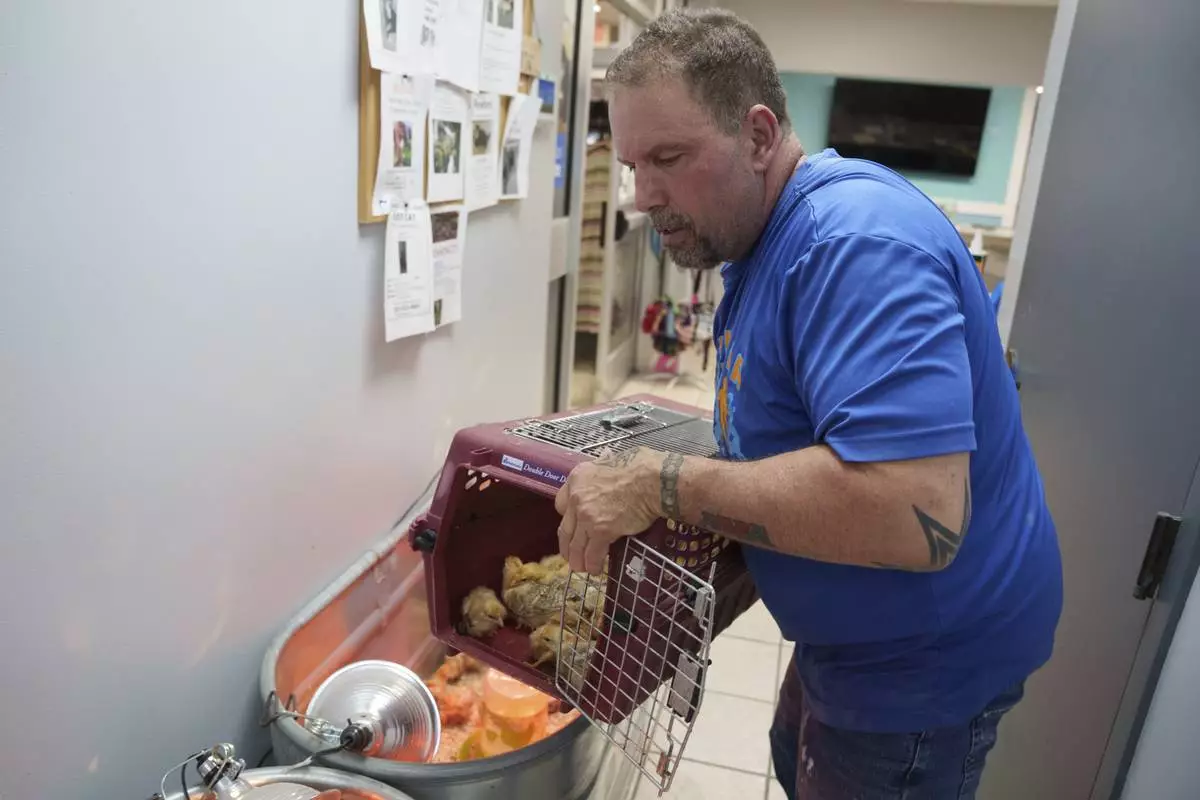 Kennel technician Mark Palmeri moves Freedom Ranger chicks to an adoption area at First State Animal Center and SPCA in Camden, Del., Friday, May 16, 2025. (AP Photo/Mingson Lau)