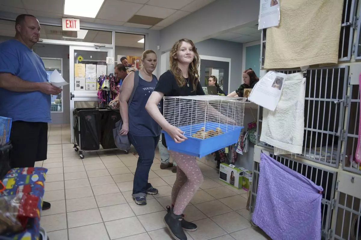 The Bruzdzinski family adopt chicks at First State Animal Center and SPCA on Friday, May 16, 2025, in Camden, Del. (AP Photo/Mingson Lau)