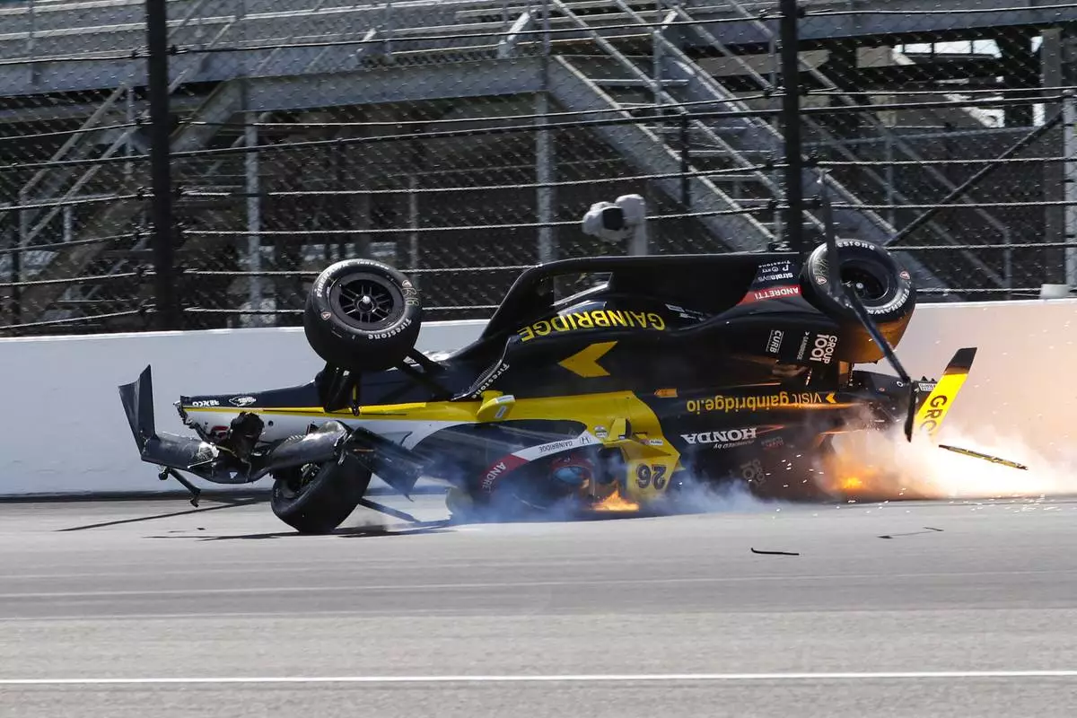 The car driven by Colton Herta slides along the track after becoming airborne after hitting the wall in the first turn during a qualification attempt for the Indianapolis 500 auto race at Indianapolis Motor Speedway in Indianapolis, Saturday, May 17, 2025. (AP Photo/Kirk DeBrunner)
