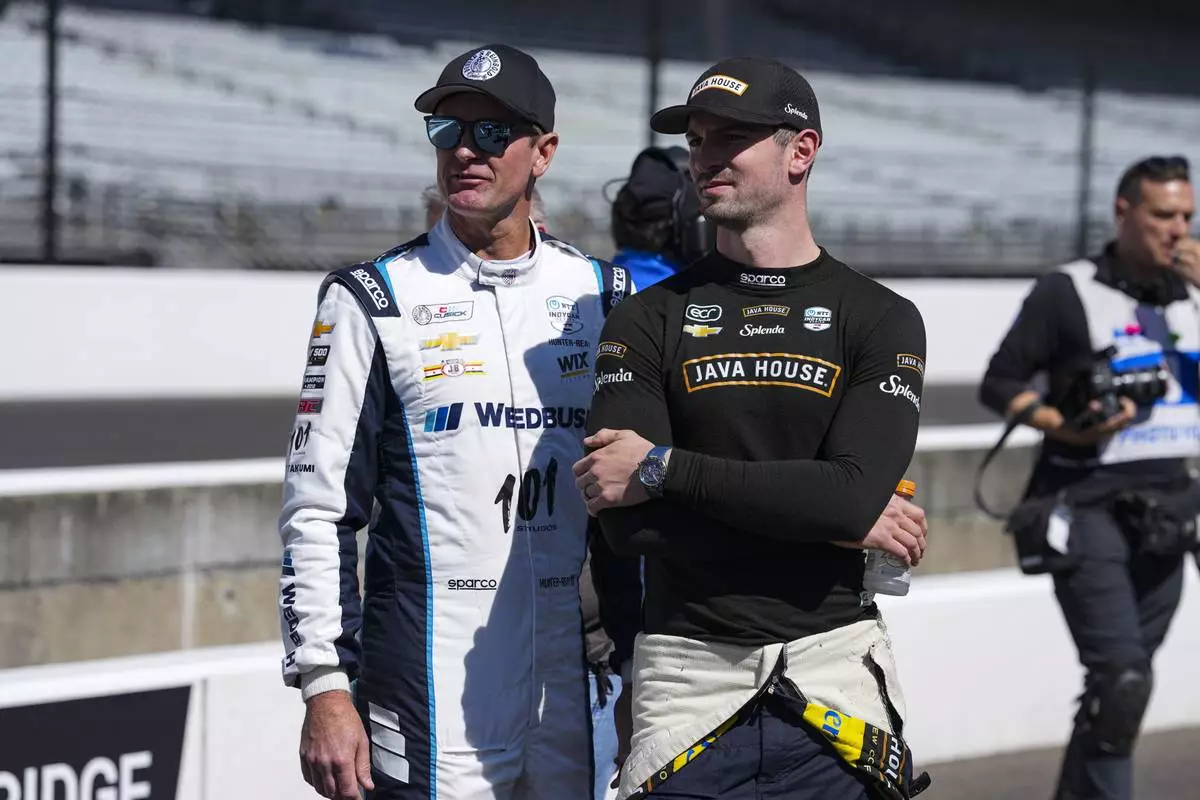 Ryan Hunter-Reay, left, and Alexander Rossi talk as they wait for their turn during qualification for the Indianapolis 500 auto race at Indianapolis Motor Speedway in Indianapolis, Saturday, May 17, 2025. (AP Photo/Michael Conroy)