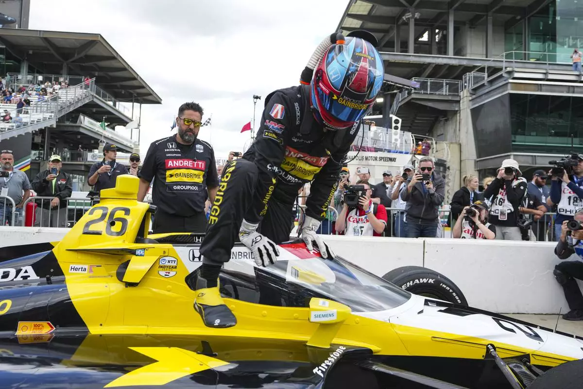 Colton Herta prepares climbs out of his car during qualifications for the Indianapolis 500 auto race at Indianapolis Motor Speedway in Indianapolis, Saturday, May 17, 2025. (AP Photo/Michael Conroy)