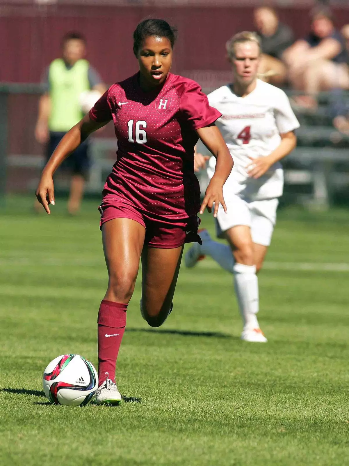 FILE - Harvard's Margaret Purce, left, kicks the ball past Massachusetts' Rebekka Sverrisdottir in the first half of an NCAA college soccer game Sunday, Sept. 20, 2015, in Amherst, Mass. (J. Anthony Roberts/The Republican via AP, File)