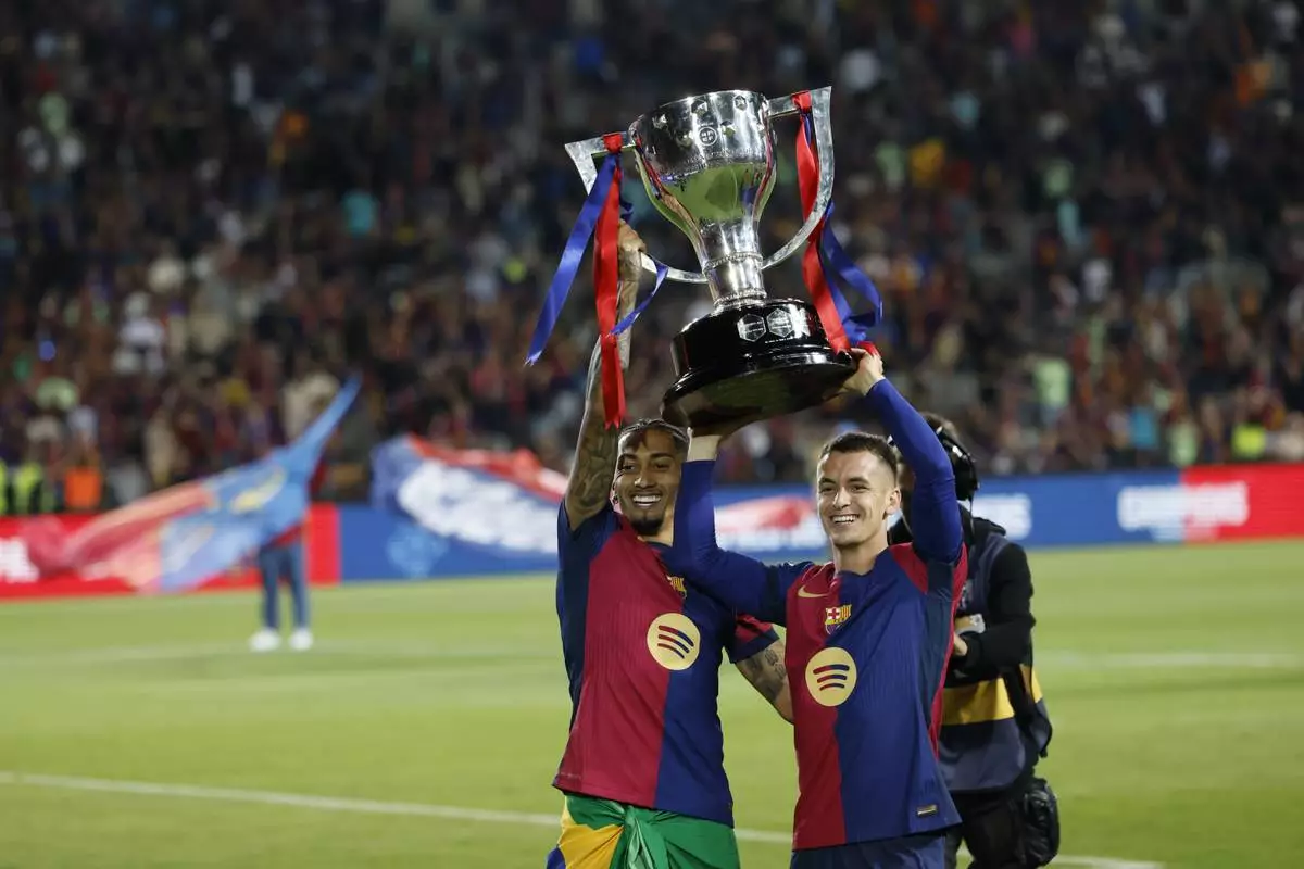 Barcelona's Raphinha lifts the trophy during celebration of winning the La Liga after the Spanish La Liga soccer match between Barcelona and Villarreal at Lluis Companys Olympic Stadium in Barcelona, Spain, Sunday, May 18, 2025. (AP Photo/Joan Monfort)