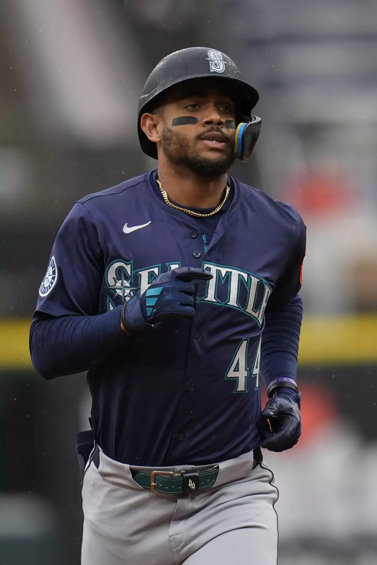 Seattle Mariners' Julio Rodríguez (44) runs the bases after hitting a three-run home run during the first inning of a baseball game against the Chicago White Sox, Wednesday, May 21, 2025, in Chicago. (AP Photo/Erin Hooley)