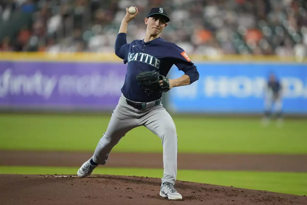 Seattle Mariners starting pitcher George Kirby throws during the first inning of a baseball game against the Houston Astros in Houston, Thursday, May 22, 2025. (AP Photo/Ashley Landis)
