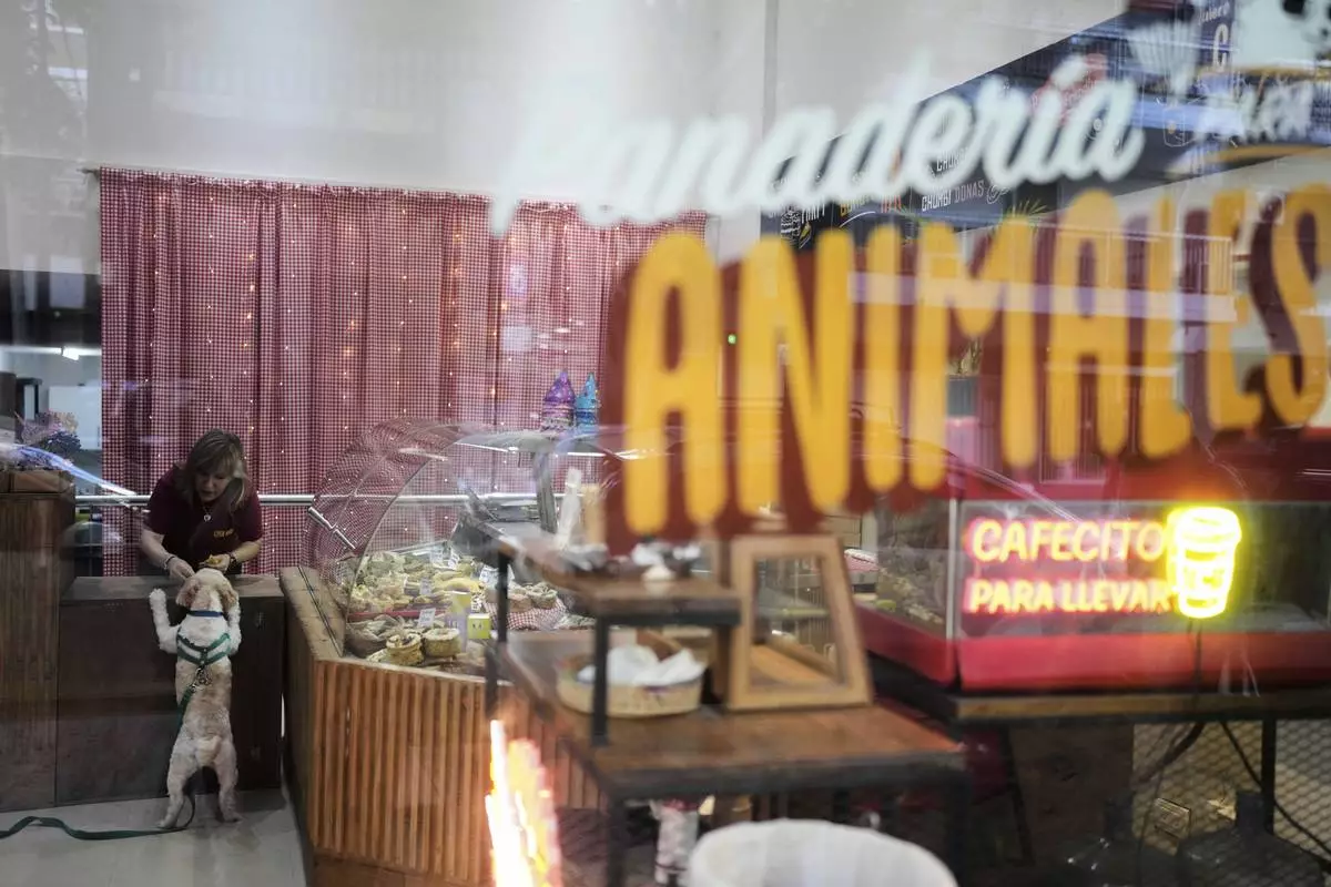 Co-owner Rocio Dominguez offers a treat to Tony, one of her regulars, at Chumbis, an artisanal bakery for animals, in Buenos Aires, Argentina, Friday, April 4, 2025. (AP Photo/Natacha Pisarenko)