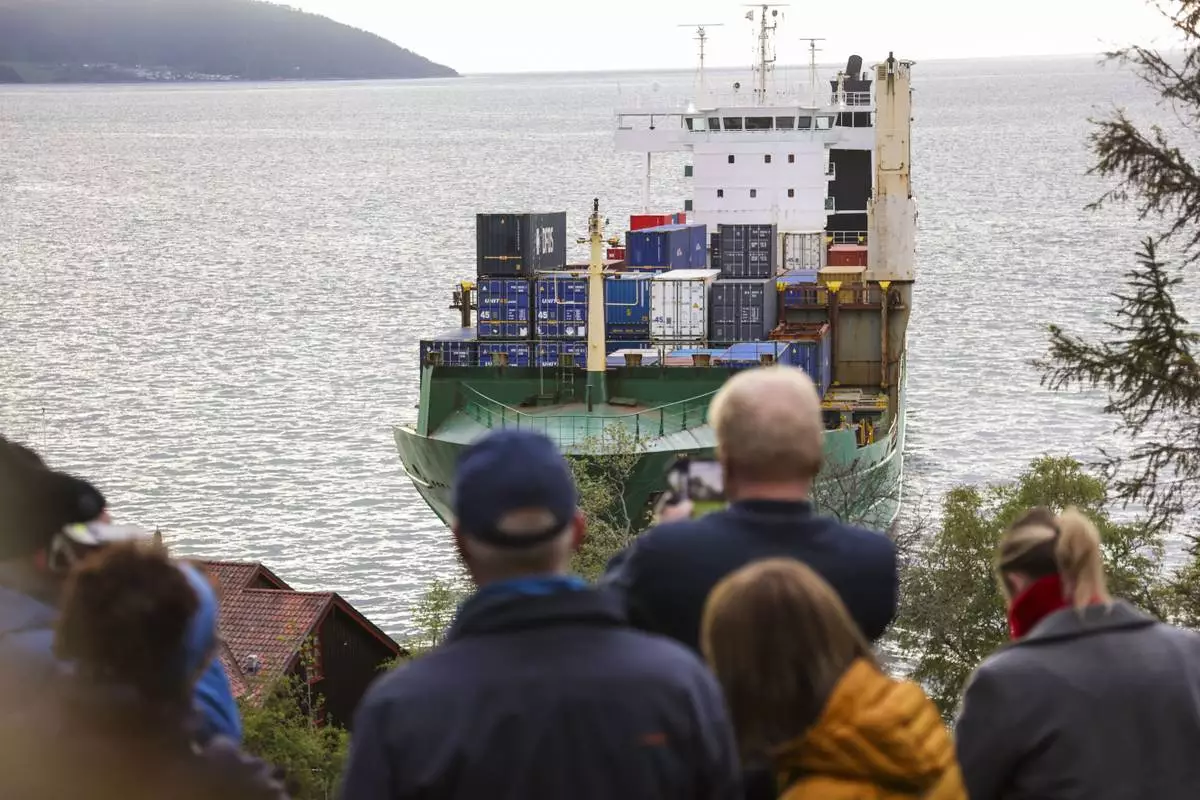 People observe a 135-meter-long container ship that ran aground in the Trondheimsfjord, outside Byneset, in Trondheim, Norway, Thursday May 22, 2025. The container ended up on land near a house on Thursday night. (Jan Langhaug/NTB Scanpix via AP)