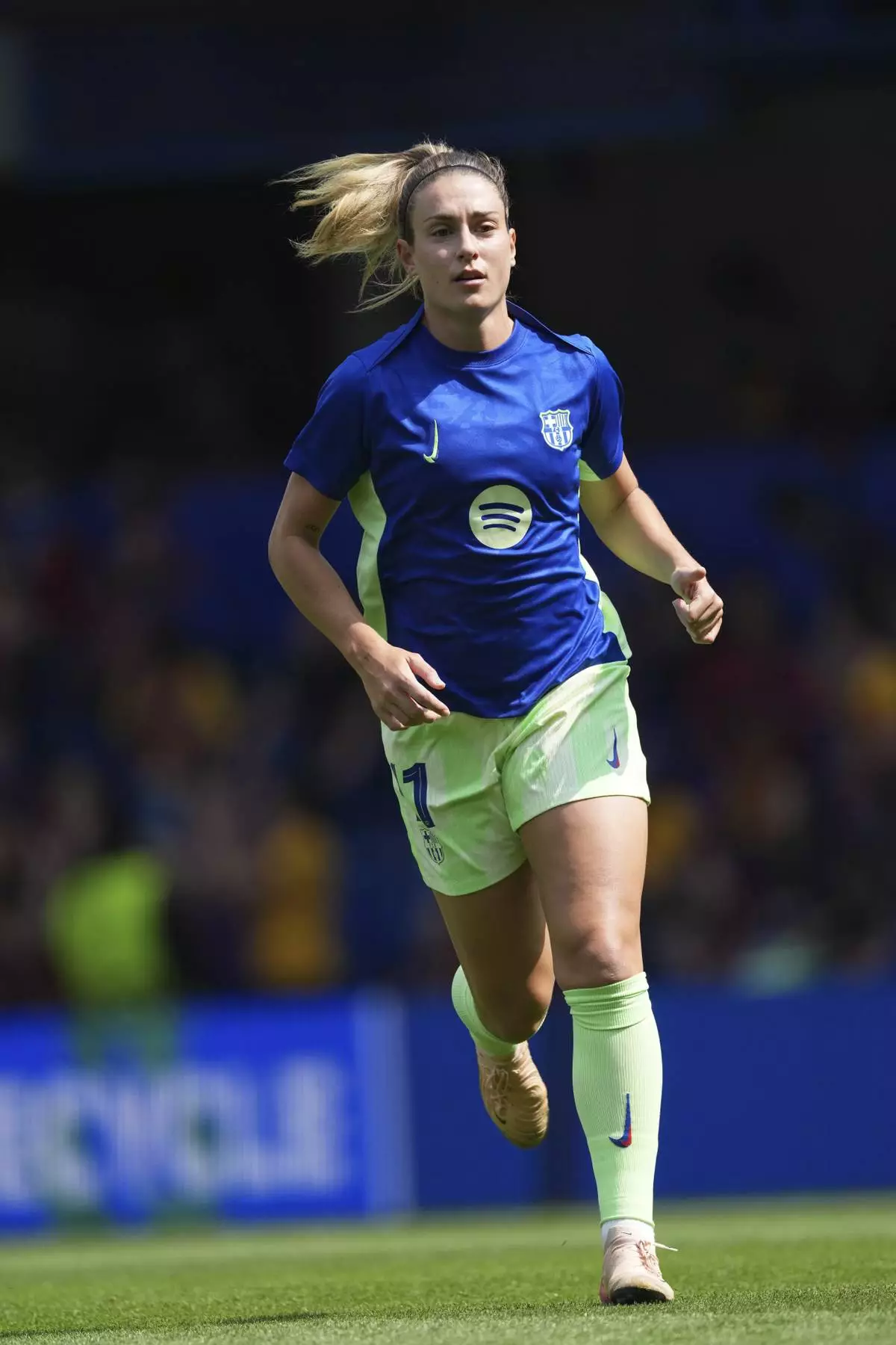 FILE - Barcelona's Alexia Putellas runs during warmup before the women's Champions League semifinals, second leg, soccer match against Chelsea FC at Stamford Bridge in London, April 27, 2025. (AP Photo/Dave Shopland, File)