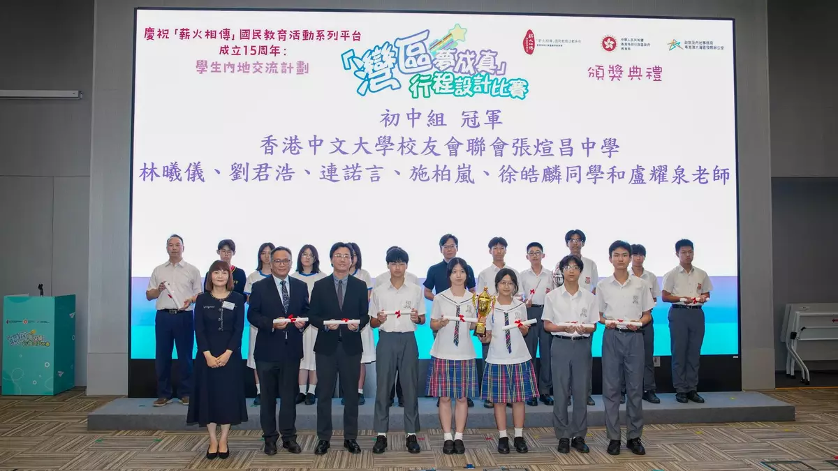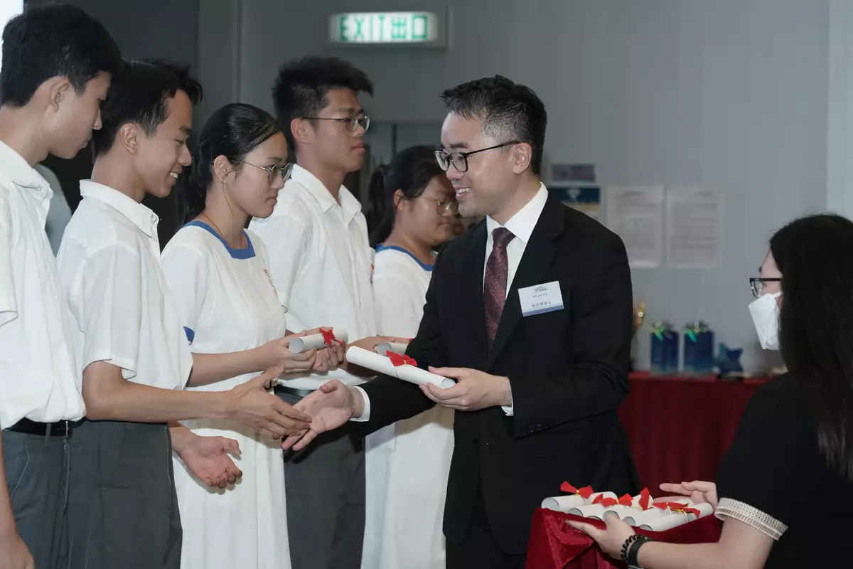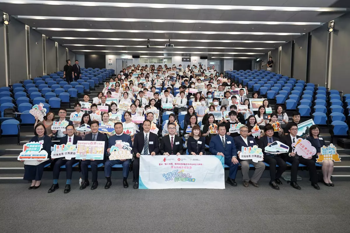 The Education Bureau (EDB) and the Guangdong-Hong Kong-Macao Greater Bay Area (GBA) Development Office of the Constitutional and Mainland Affairs Bureau (CMAB) have organised the Award Presentation Ceremony for Celebration of the 15th Anniversary of the Founding of the "Passing on the Torch" National Education Activity Series Platform: "Dreams to Greater Bay Area Come True" Itinerary Design Competition under Mainland Exchange Programmes for Students today (May 23). Teachers and students of the winning teams will be fully subsidised to join award-winning tours modeled on the itineraries of the champion teams, and attend the sharing sessions for experience sharing upon completion of the tours to deepen students' understanding of the development of the GBA.