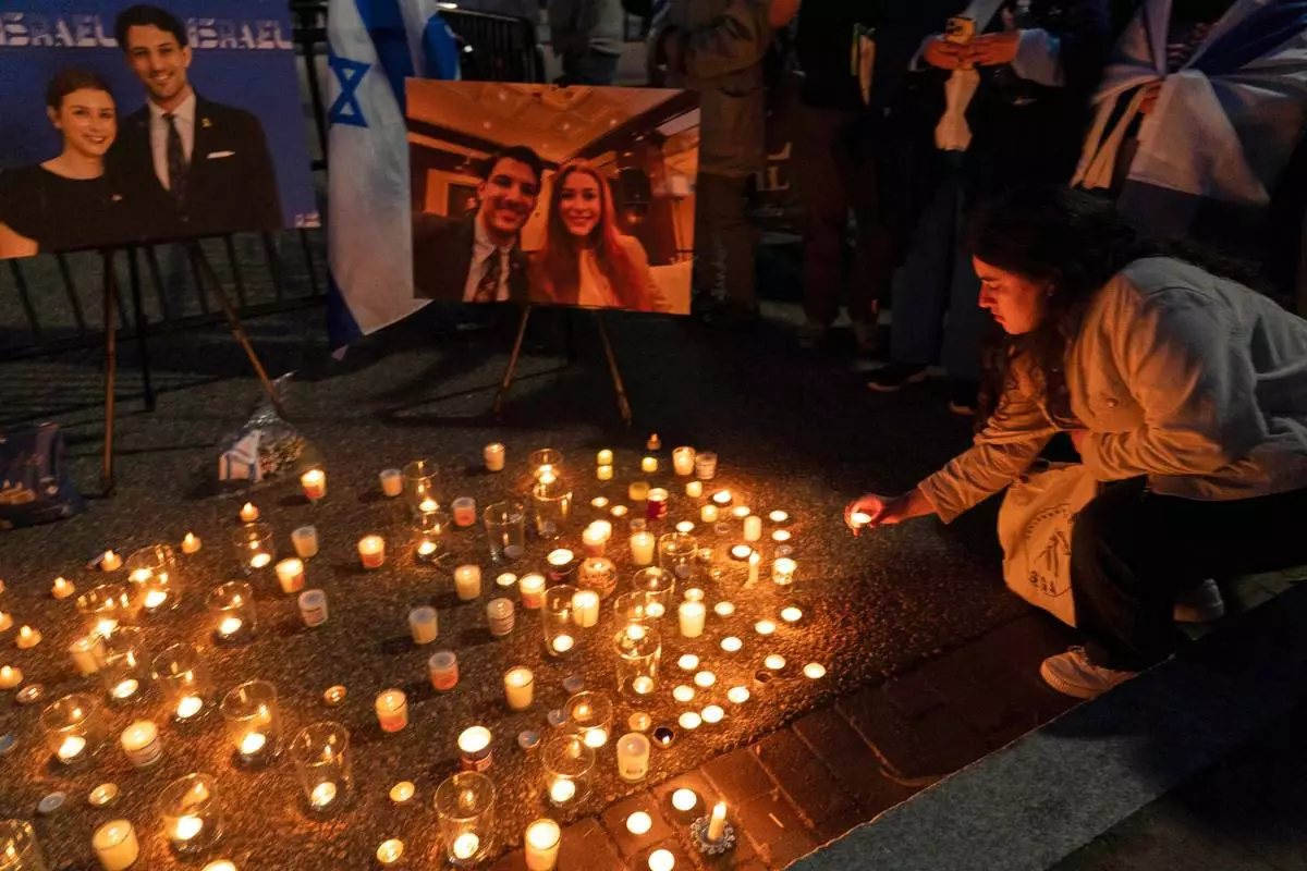 People gather to light candles in a makeshift memorial to honor Yaron Lischinsky and Sarah Milgrim who were killed as they left an event at the Capital Jewish Museum in Washington, during a candlelight vigil outside of the White House in Washington, Thursday, May 22, 2025. (AP Photo/Jose Luis Magana)