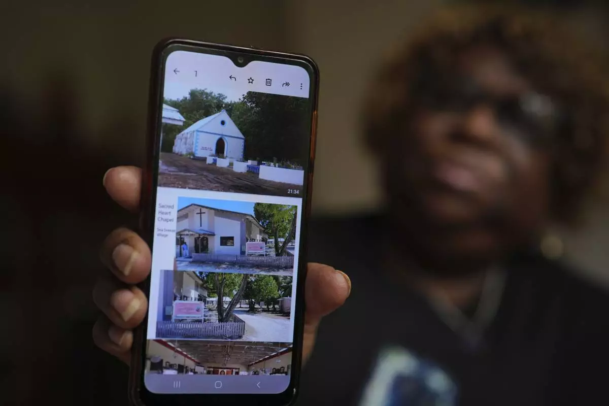 Chagossian Bernadette Dugasse shows photos of a church in the Chagos Islands during an interview with The Associated Press, at her home in London, Tuesday, March 25, 2025. (AP Photo/Kin Cheung)
