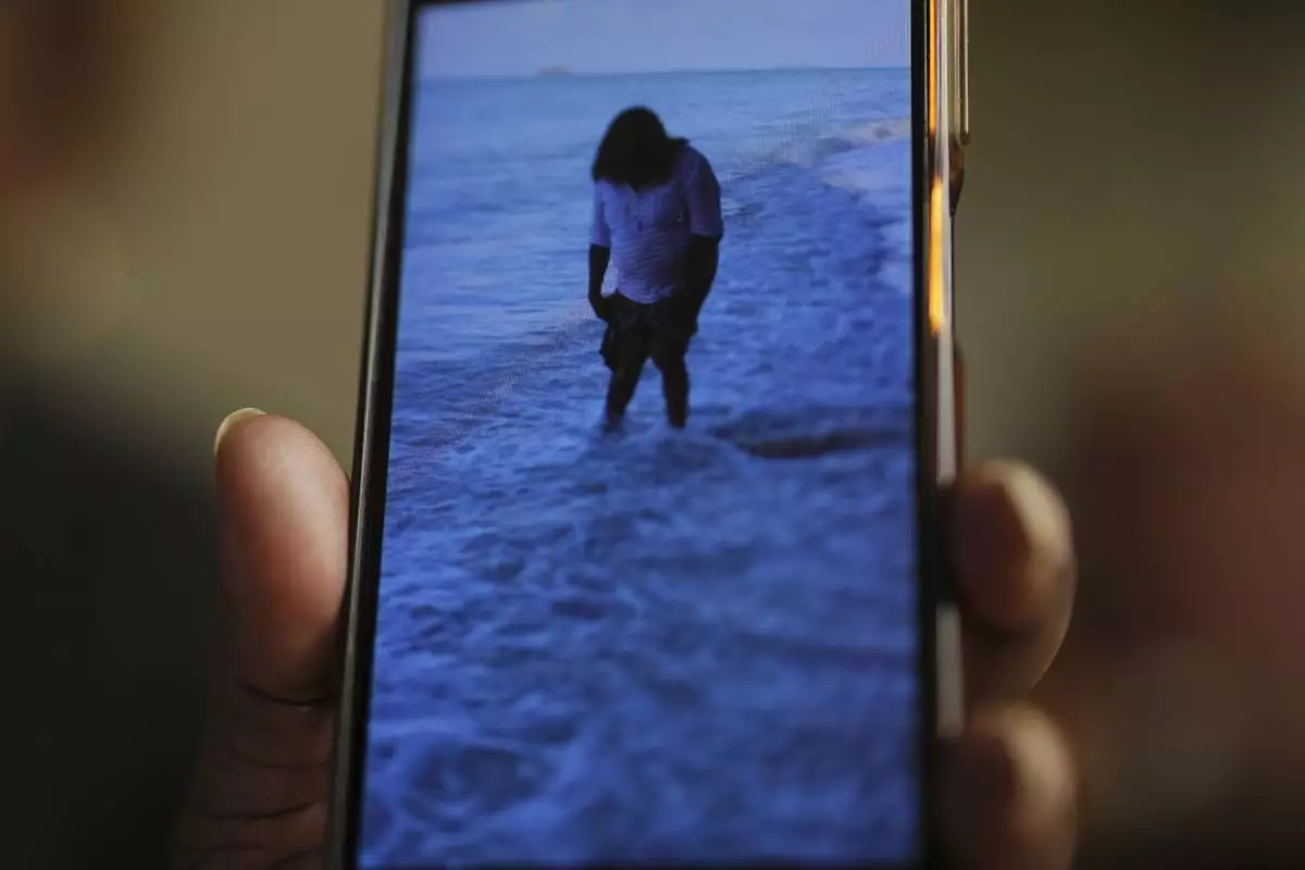 Chagossian Bernadette Dugasse shows photos of the Chagos Islands during an interview with The Associated Press, at her home in London, Tuesday, March 25, 2025. (AP Photo/Kin Cheung)