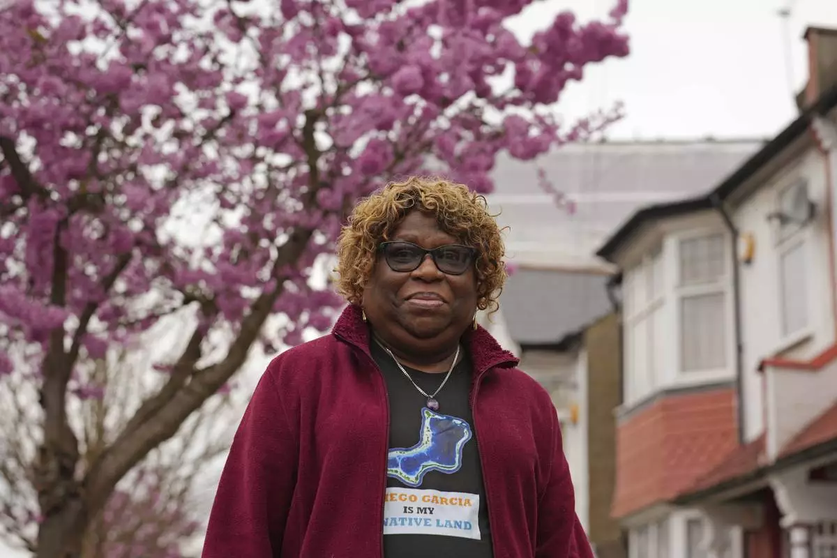 Chagossian Bernadette Dugasse poses for a photograph outside her home in London, Tuesday, March 25, 2025. (AP Photo/Kin Cheung)