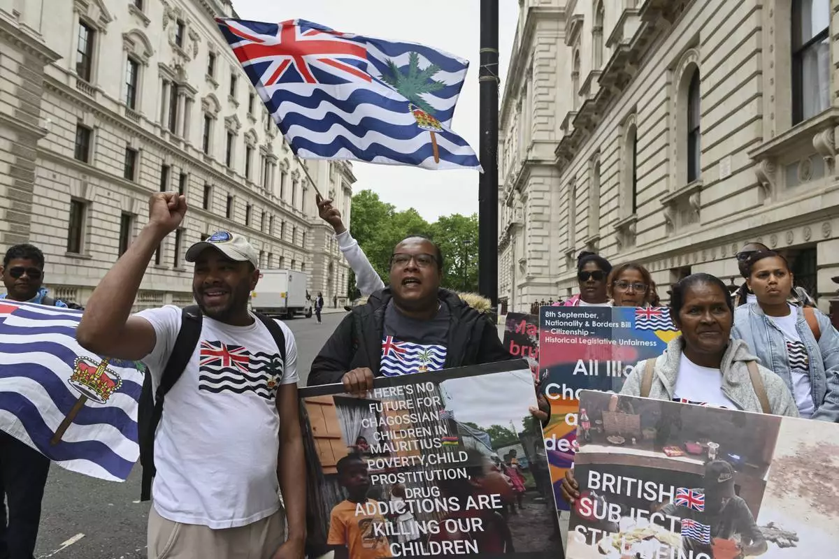People demonstrate outside the Foreign Office in London, Thursday, May 22, 2025, after a British court blocked the U.K. from transferring sovereignty over the Chagos Islands to Mauritius hours before the agreement was due to be signed. (AP Photo/Thomas Krych)