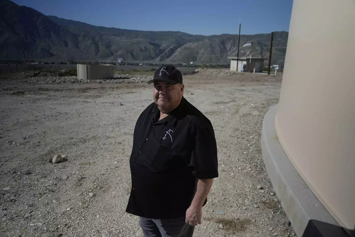 Mark Whaling, a retired firefighter, stands in front of a Heli-Hydrant, a small, open tank that helicopters can rely on to get water faster for urban fires, Friday, April 11, 2025, in Cabazon, Calif. (AP Photo/Brittany Peterson)