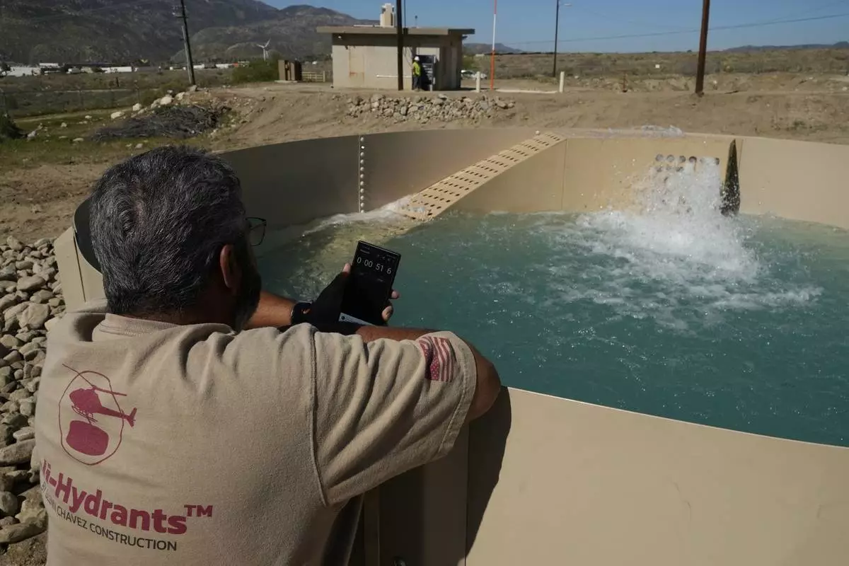 Glenn Chavez tests a newly installed Heli-Hydrant, a small, open tank that helicopters can rely on to get water faster for urban fires, Friday, April 11, 2025, in Cabazon, Calif. (AP Photo/Brittany Peterson)