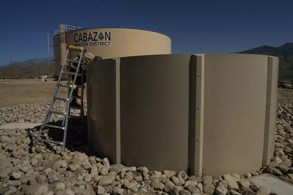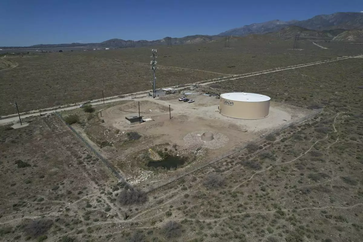A newly installed Heli-Hydrant, a small, open tank that helicopters can rely on to get water faster for urban fires, sits in Cabazon, Calif., Friday, April 11, 2025. (AP Photo/Brittany Peterson)