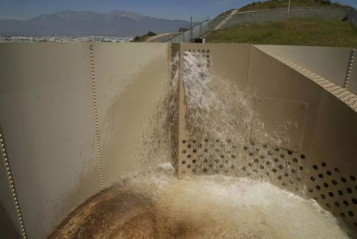 A Heli-Hydrant, a small, open tank that helicopters can rely on to get water faster for urban fires, fills with water during a demonstration Thursday, April 10, 2025, in Jurupa Valley, Calif. (AP Photo/Brittany Peterson)