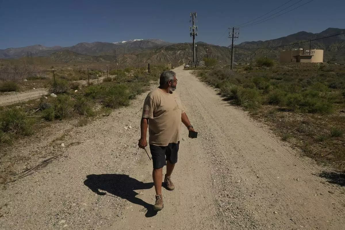 Glenn Chavez sets a timer as water fills a newly installed Heli-Hydrant, a small, open tank that helicopters can rely on to get water faster for urban fires, Friday, April 11, 2025, in Cabazon, Calif. (AP Photo/Brittany Peterson)
