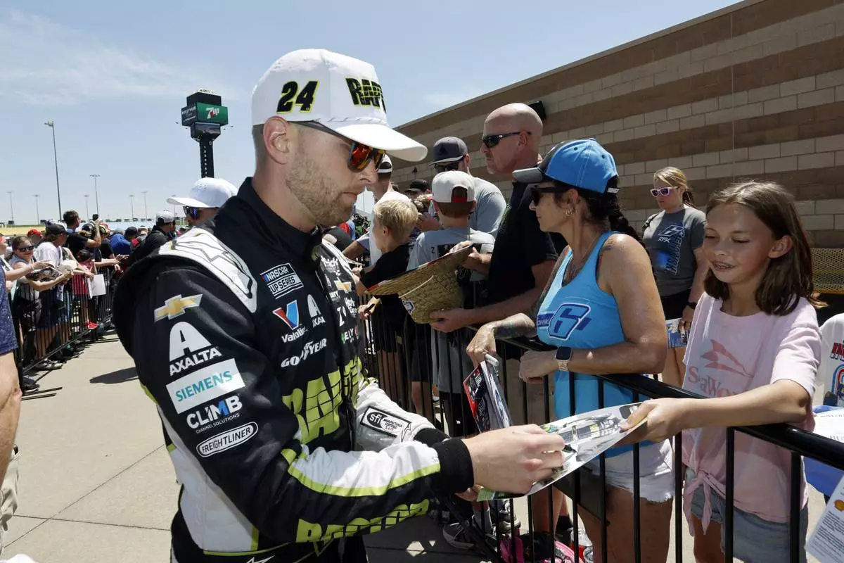 William Byron signs autographs before a NASCAR Cup Series auto race at Kansas Speedway in Kansas City, Kan., Sunday, May 11, 2025. (AP Photo/Colin E. Braley)