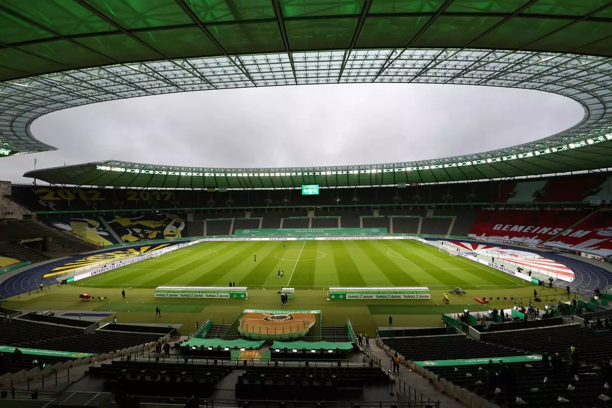FILE - General view of the Olympiastadion Berlin stadium prior to the German soccer cup (DFB Pokal) final match between RB Leipzig and Borussia Dortmund in Berlin, Germany, Thursday, May 13, 2021. (Maja Hitij/Pool via AP, file)