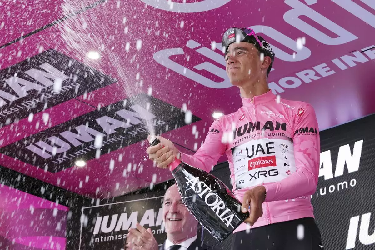 Mexico's Isaac del Toro of Uae Team Emirates celebrates after the 13th stage of the Giro d'Italia cycling race from Rovigo to Vicenza, Italy, Friday, May 23, 2025. (Gian Mattia D'Alberto/LaPresse via AP)