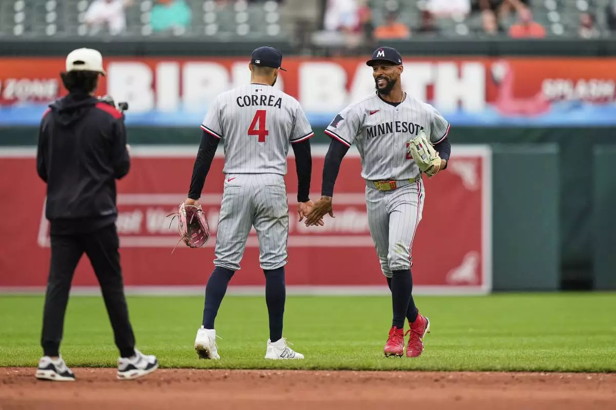 Minnesota Twins' Carlos Correa (4) and Byron Buxton, right, celebrate their team's victory over the Baltimore Orioles after the first baseball game of a doubleheader, Wednesday, May 14, 2025, in Baltimore. (AP Photo/Stephanie Scarbrough)