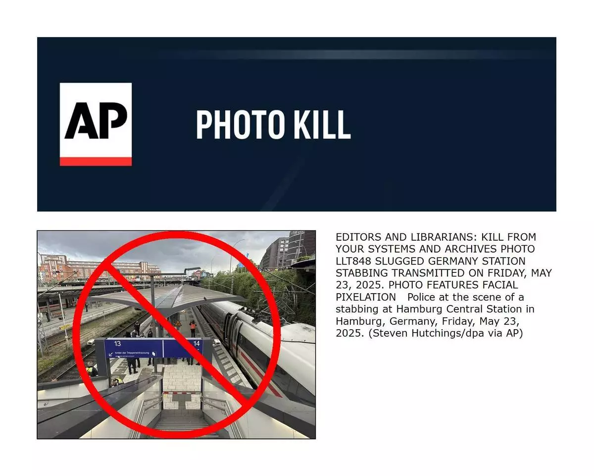 EDITORS AND LIBRARIANS: KILL FROM YOUR SYSTEMS AND ARCHIVES PHOTO LLT848 SLUGGED GERMANY STATION STABBING TRANSMITTED ON FRIDAY, MAY 23, 2025. PHOTO FEATURES FACIAL PIXELATION Police at the scene of a stabbing at Hamburg Central Station in Hamburg, Germany, Friday, May 23, 2025. (Steven Hutchings/dpa via AP)