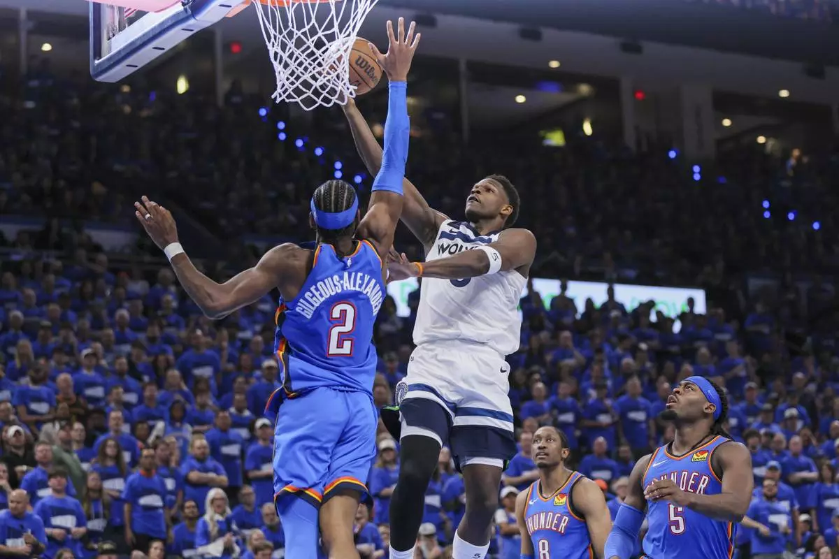 MINNEAPOLIS (AP) — The newest NBA MVP put his head down and dribbled toward the basket, an attempt by Shai Gilgeous-Alexander to lunge past one of the league's best perimeter defenders midway through the fourth quarter of another decisive victory by Oklahoma City in the Western Conference finals.