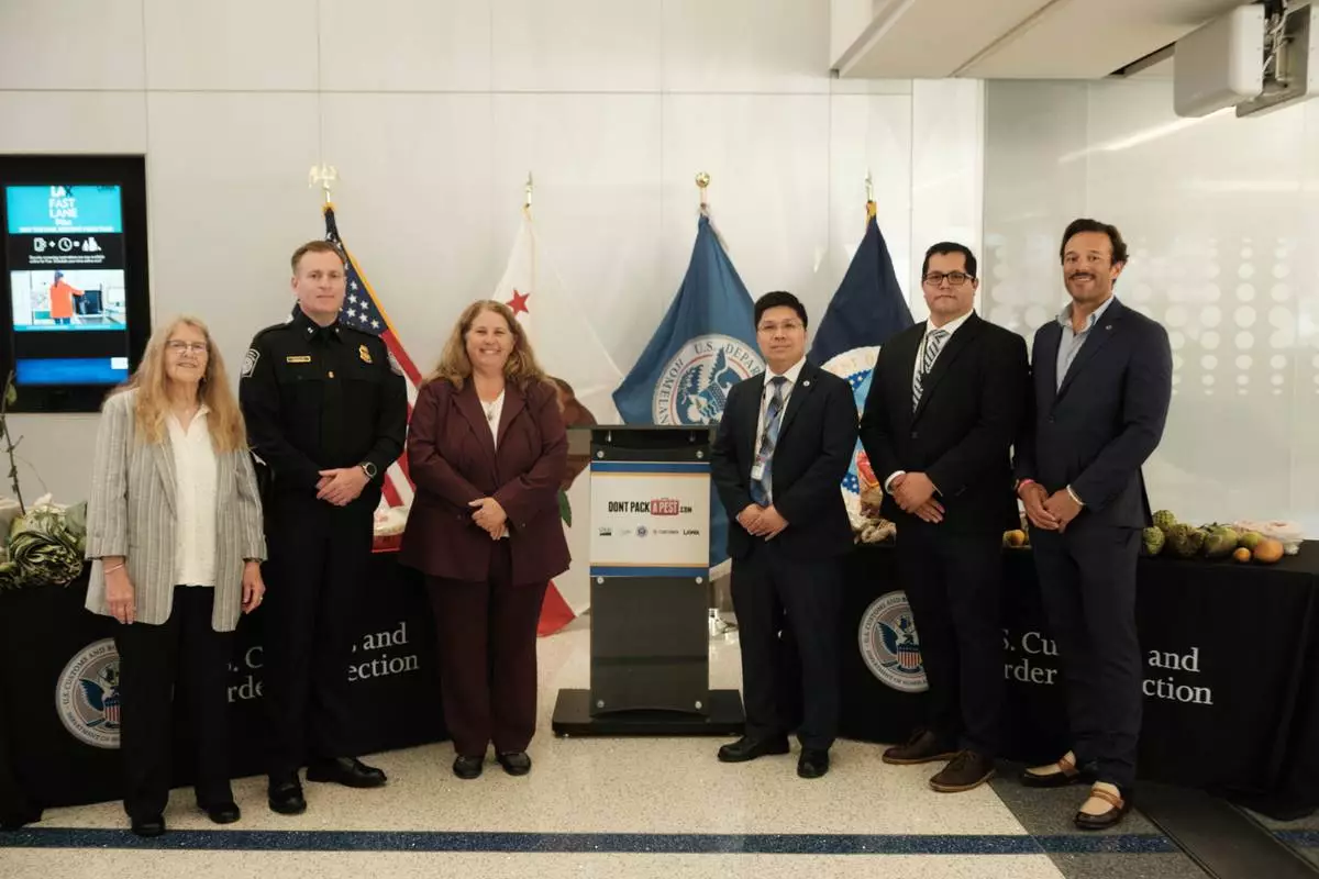 Pictured (left to right): United States Department of Agriculture (USDA), California State Plant Health Director Helene Wright; U.S. Customs and Border Protection (CBP), Port Director of Los Angeles International Airport Andrew H. Douglas; California Department of Food and Agriculture (CDFA), Director of Plant Health and Pest Prevention Services Victoria Hornbaker; Los Angeles County Agricultural Commissioner’s Office Deputy Director Khoa Lam; Orange County Agricultural Commissioner Jose Arriaga; Los Angeles World Airports, Public Information Officer Justin Upshaw. [Credit: Image courtesy of The California Department of Food and Agriculture (CDFA). All rights reserved. For media use only.]