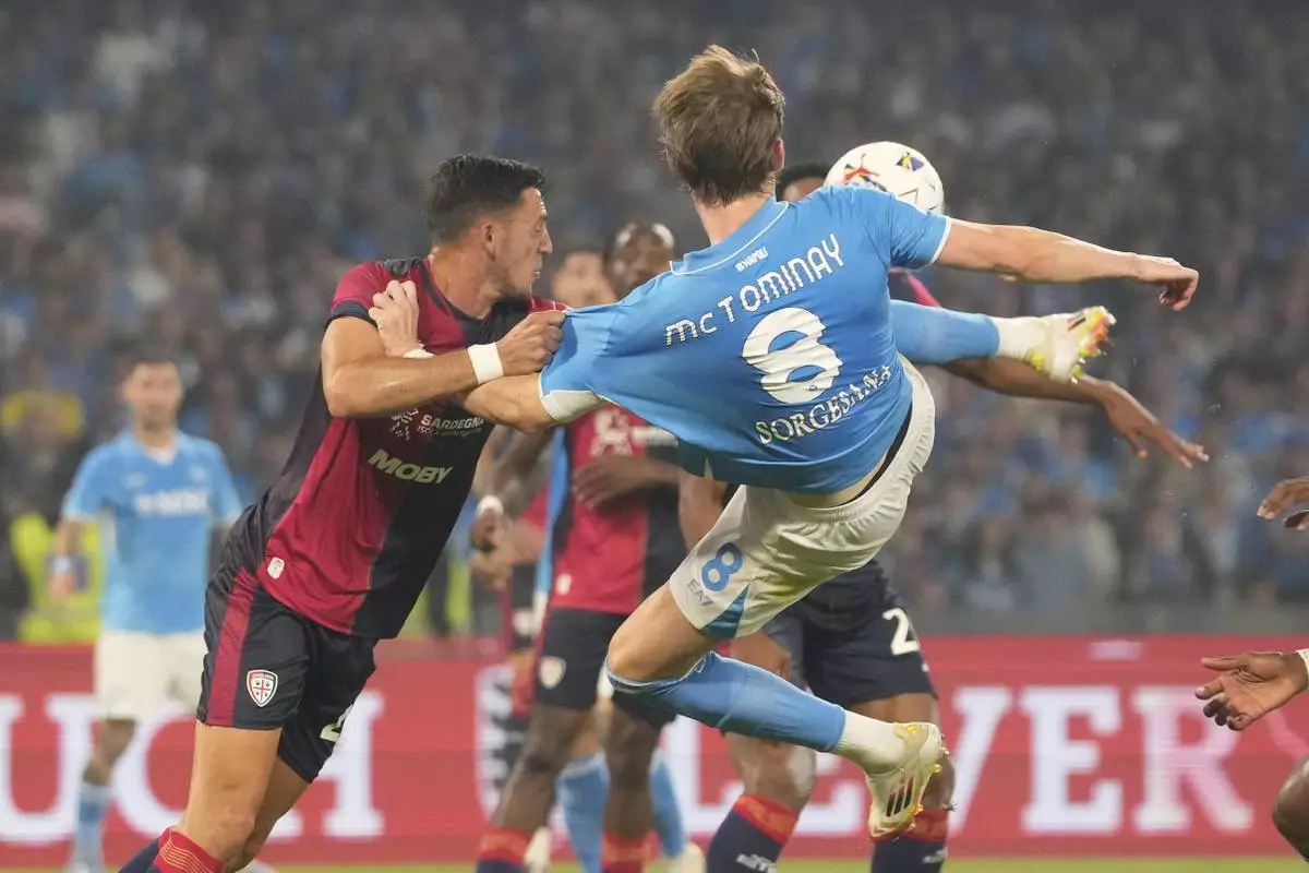 Napoli's Scott McTominay scores his side's first goal during the Italian Serie A soccer match between Napoli and Cagliari at the Diego Maradona stadium in Naples, Italy, Friday, May 23, 2025. (AP Photo/Gregorio Borgia)