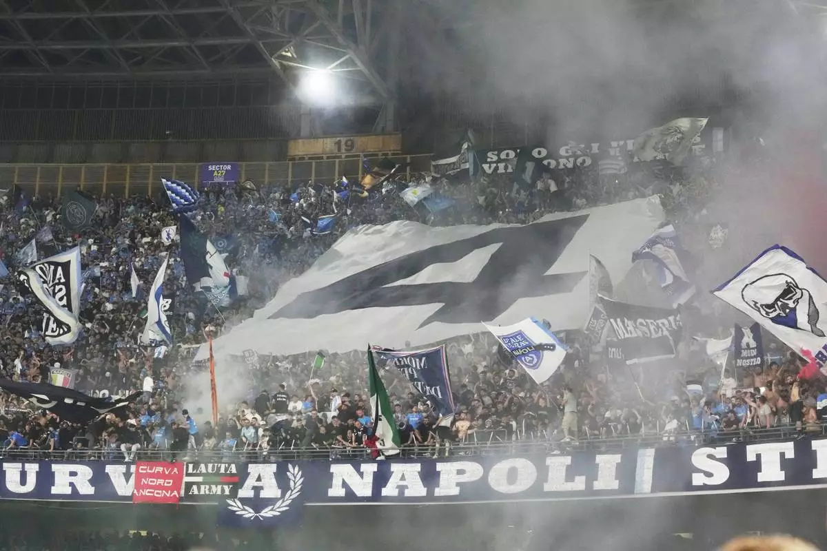 Fans celebrate showing a number 4 during the Italian Serie A soccer match between Napoli and Cagliari at the Diego Maradona stadium in Naples, Italy, Friday, May 23, 2025. (AP Photo/Gregorio Borgia)