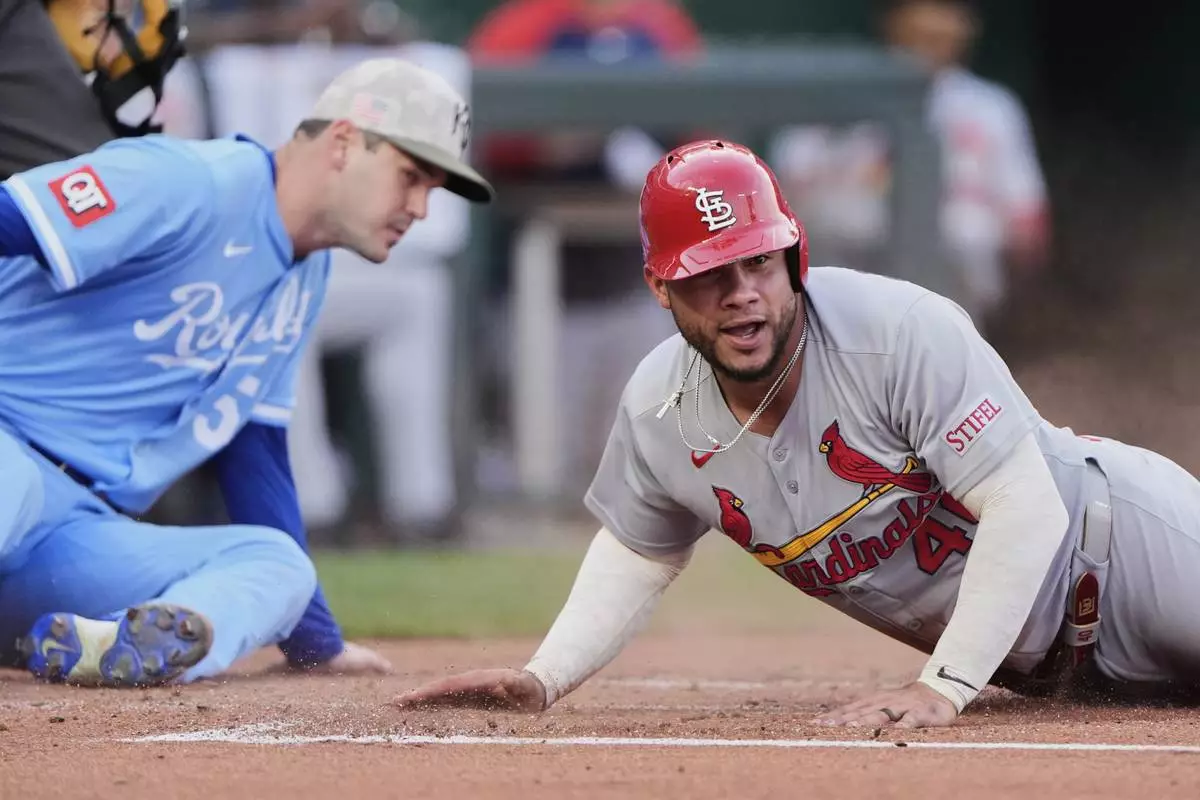 St. Louis Cardinals' Willson Contreras beats the tag by Kansas City Royals starting pitcher Cole Ragans, left, to score on a wild pitch during the second inning of a baseball game, Friday, May 16, 2025, in Kansas City, Mo. (AP Photo/Charlie Riedel)