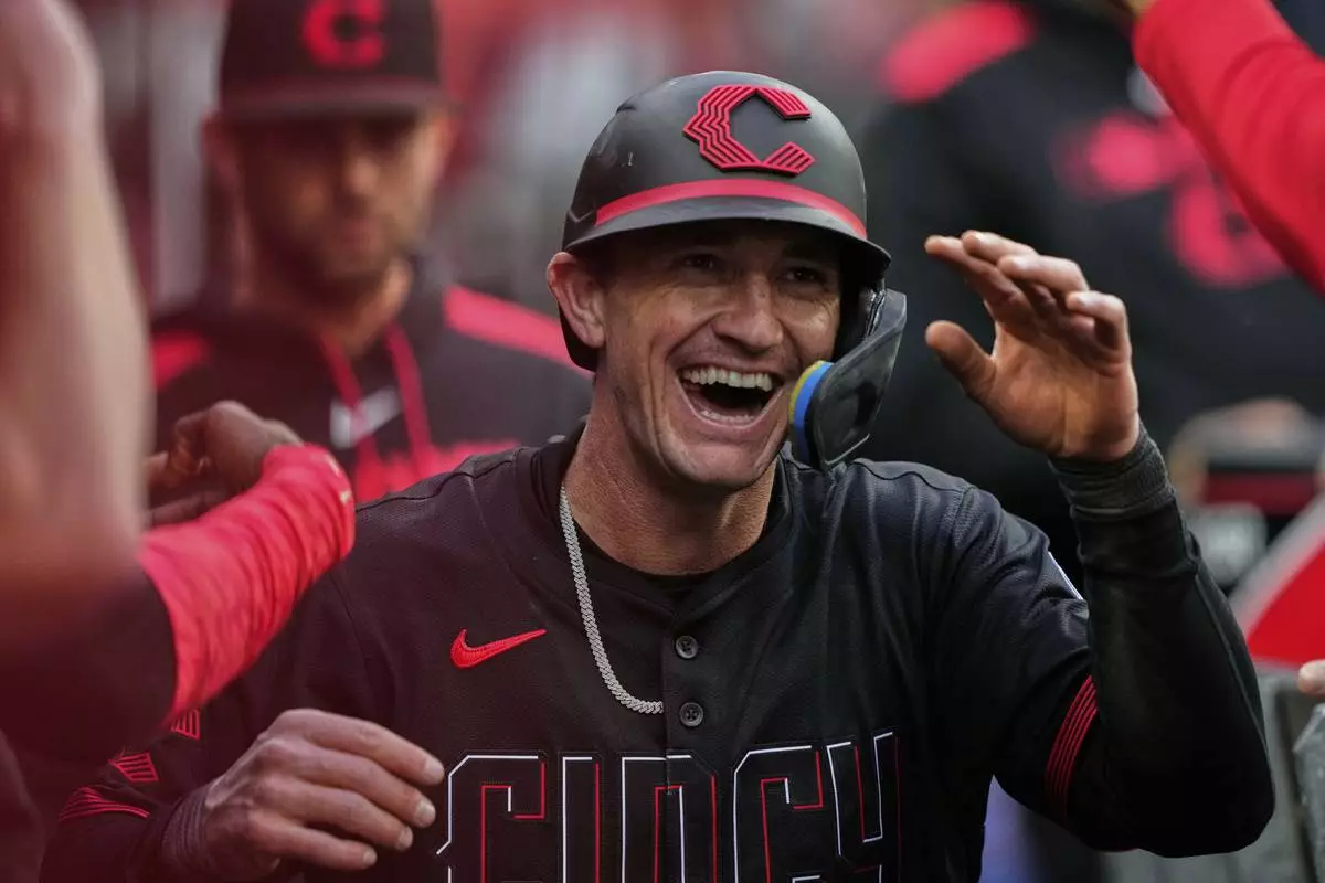 Cincinnati Reds Austin Hays celebrates in the dugout after scoring on a wild pitch from Chicago Cubs pitcher Matthew Boyd in the third inning of a baseball game, Friday, May 23, 2025, in Cincinnati. (AP Photo/Carolyn Kaster)