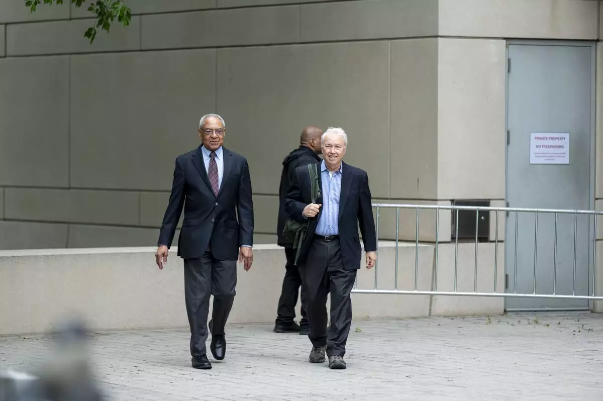 U.S. Institute of Peace (USIP) acting President George Moose, left, and USIP acting counsel George Foote walk out of the Institute to talk to reporters, Wednesday, May 21, 2025 in Washington. (AP Photo/Kevin Wolf)